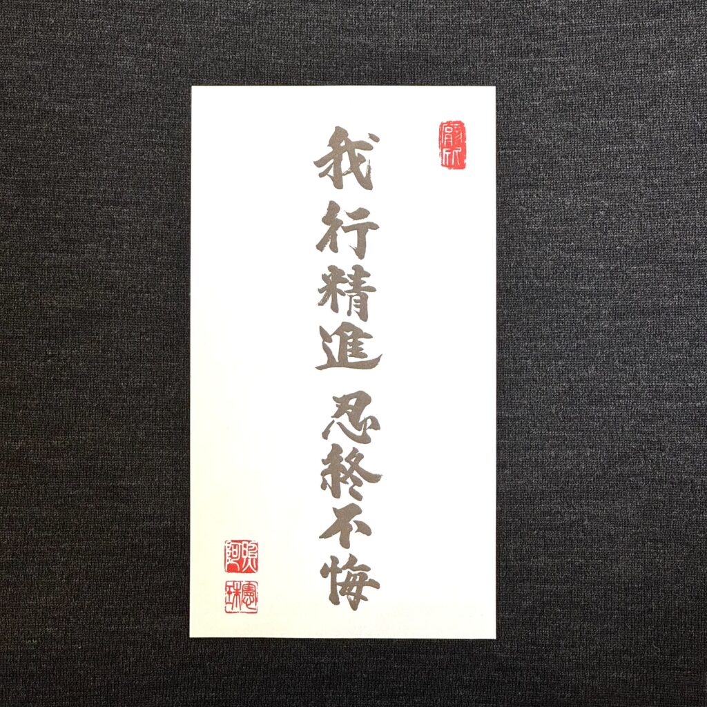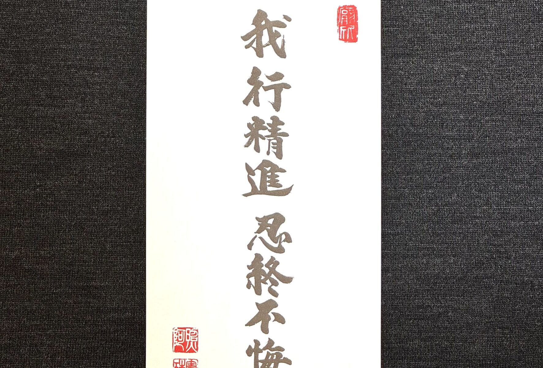 今月の言葉は『無量寿経』の中の一説「我行精進 忍終不悔」です。経典の一節ですので、あまり聞きなれない言葉かもしれません。これは阿弥陀如来がまだ修行中の身にあった頃、多くの人を救う仏となるために「どんなにつらいことにも耐え忍び、修行に励んで、決して後悔することはない」と誓った偈文で、ここには多くの衆生を救いたいという強い決意が表れています。