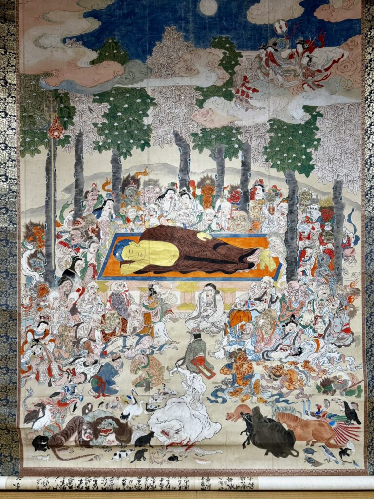法源寺に伝わる涅槃図は、弘化4年に当時の檀信徒の寄進によって収められたとの記録が残っています。弘化4年といえば、西暦1847年です。ペリーが黒船に乗って浦賀沖に現れたのが1853年ですから、それよりも6年前に作られたものです。180年近く経ちますが、色はとても鮮やかで、天井から床までの大きさがあり、大変見ごたえがあります。また、裏書には当時寄進した檀信徒の名前が墨書きされており、歴史を感じさせる涅槃図です。