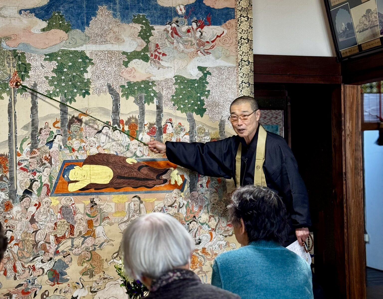 法要後は、住職が法源寺に伝わる大きな涅槃図の絵解きを行いました。