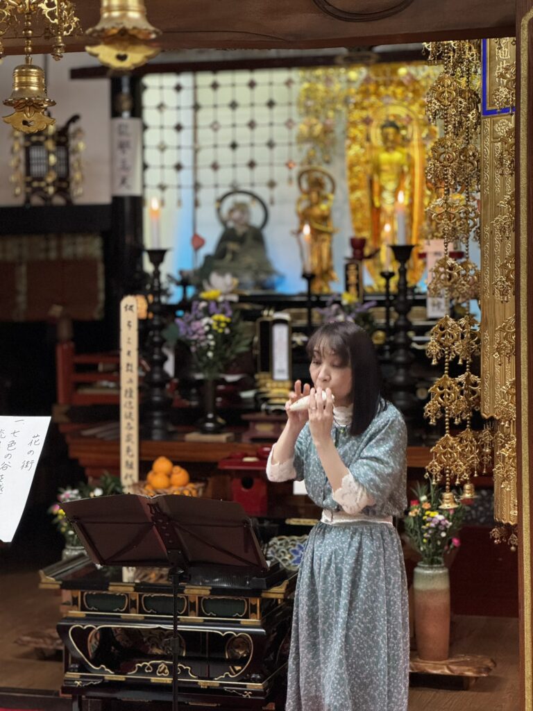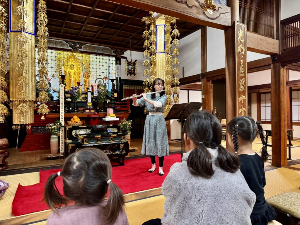 3月20日、彼岸の中日に信行会をおつとめしました。法要後には、フルート・オカリナ奏者の村林涼子さんによるミニコンサートも開催いたしました。